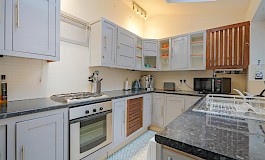 The off-shot kitchen which is larger than average, is filled with natural light, courtesy of two Velux roof windows. A side window and glazed side door add further natural light and provide access to the southerly enclosed courtyard garden, having a good range of fitted units, contrasting work surfaces and tiled splash backs. Integrated appliances are included with other appliances available. A door from the kitchen provides access down to the useful storage cellar.