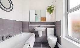The well-appointed bathroom complements the home's stylish aesthetic, ensuring convenience and comfort for all residents with its bath and separate shower cubicle.